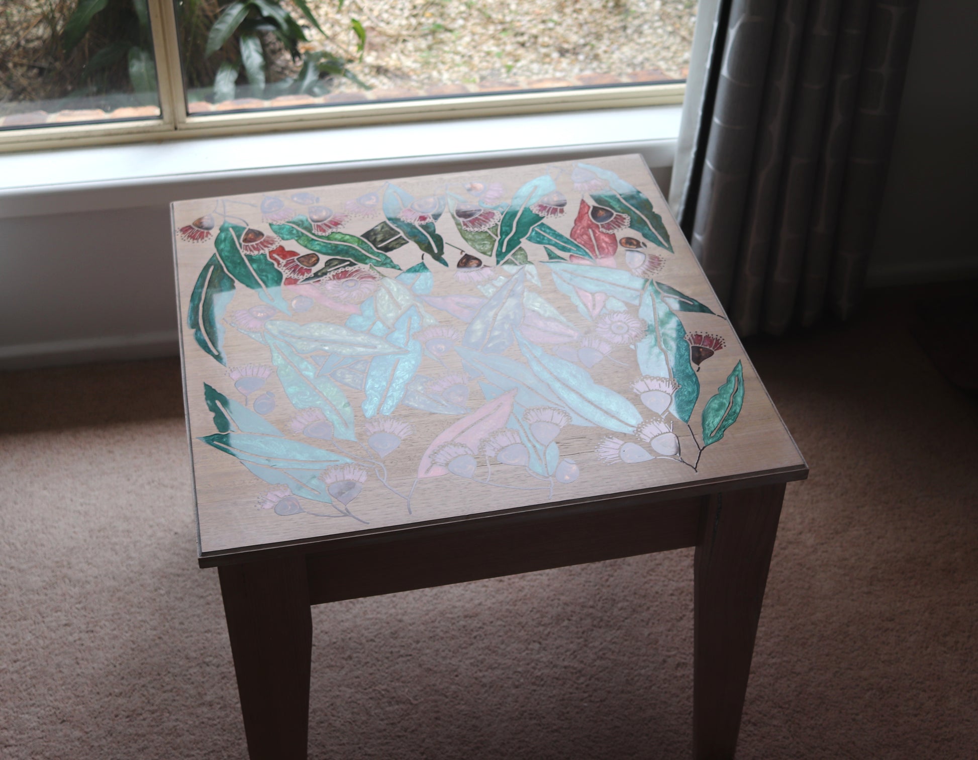 Crafted from native timber with a white finish, the table serves as a stunning canvas for the large colourful inlaid gum leaves and pastel flowers. As light dances upon the surface, the leaves come to life, revealing intricate patterns within the resin. A beautiful effect that can uplift the decor of any room.