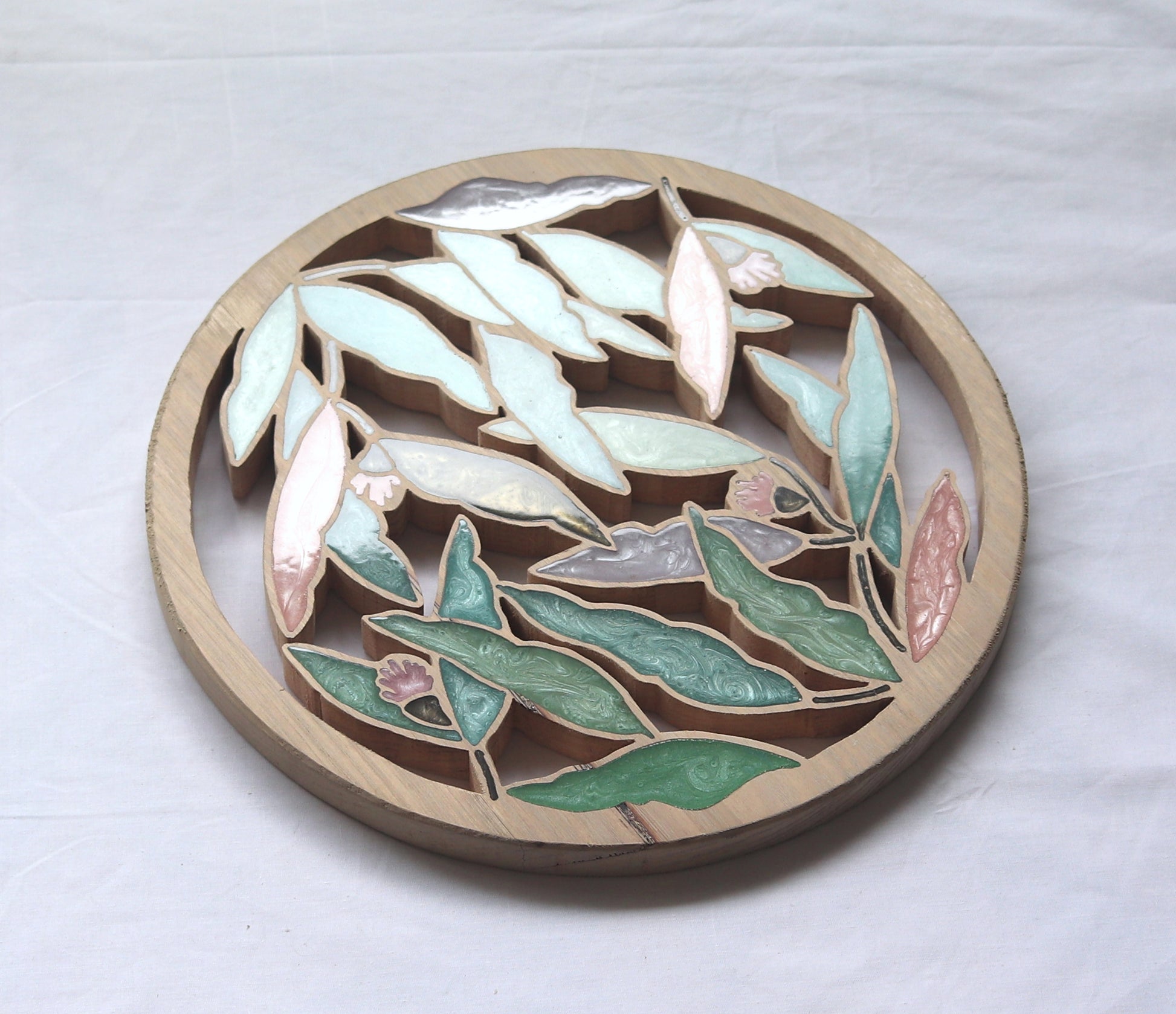 Handmade wood wall art crafted from resin and wood. This unique piece features a hand-drawn design, intricately carved and inlaid into real Australian Tasmanian Oak wood. The resin inlay adds a beautiful touch, which can shimmer and appear neon or muted in sunlight, creating a dynamic and ambient effect. Especially as the sun rises and sets!