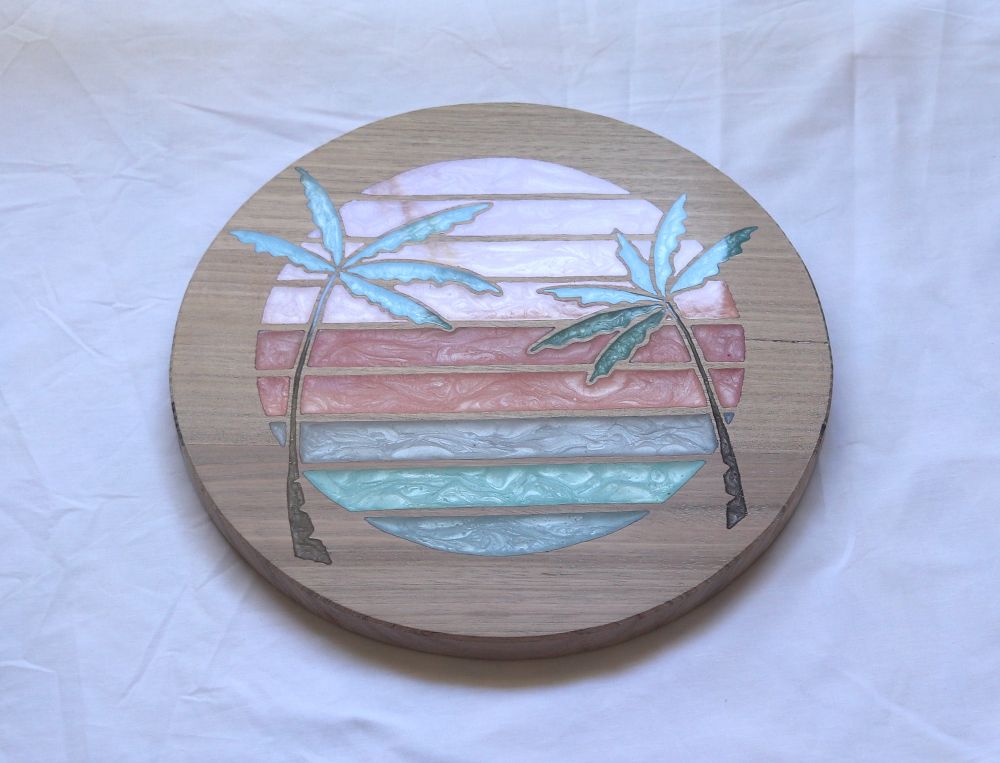 Handmade wood wall art crafted from resin and wood. This unique piece features a hand-drawn design, intricately carved and inlaid into real Australian Tasmanian Oak wood. The resin inlay adds a beautiful touch, which can shimmer and appear neon or muted in sunlight, creating a dynamic and ambient effect. Especially as the sun rises and sets!